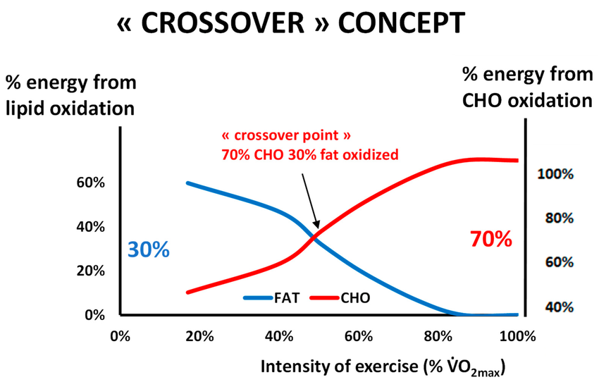 C’est là où l’endurance fondamentale devient cruciale. Ce phénomène est au cœur de ce que les physiologistes appellent le “crossover concept”. Il décrit le point à partir duquel le corps commence à privilégier les glucides plutôt que les lipides pour produire de l’énergie. En dessous de ce point, la majorité de l’énergie provient de l’oxydation des graisses ; au-dessus, les sucres prennent le relais.