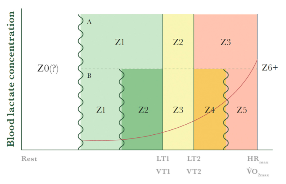 Figure. Correspondance entre le modèle à 3 zones (basé sur les seuils physiologiques LT1/VT1 et LT2/VT2) et le modèle pratique à 5 zones utilisé en entraînement. La Zone 2 ciblée pour l’endurance fondamentale correspond à l’intensité située juste en dessous du premier seuil lactique ou ventilatoire (LT1/VT1) (Sitko et al., 2025).